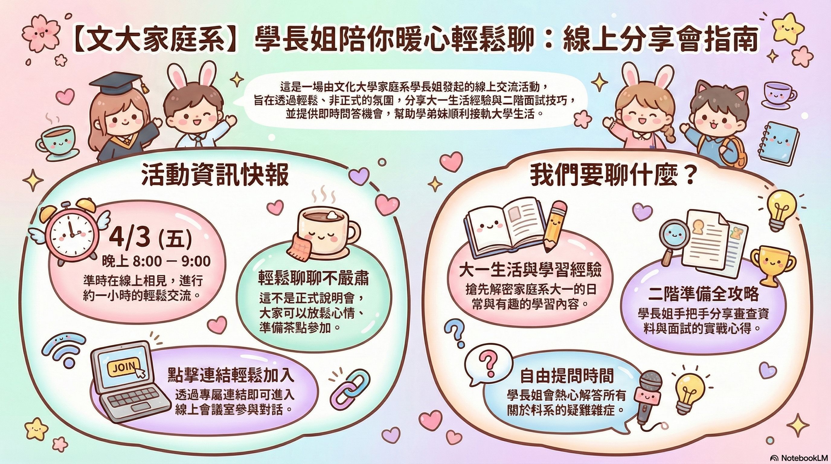 115學年大學申請入學第一階段篩選結果已公告,本系訂於4月3日(星期五)晚上8:00-9:00進行線上說明會,介紹本系以及學長姐的學習分享,歡迎同學參加。
